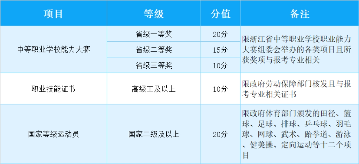 以上賦分為個(gè)人項(xiàng)目,其他所有團(tuán)體項(xiàng)目成員按個(gè)人項(xiàng)目分值的50%計(jì)分??忌煌愴?xiàng)可累計(jì)賦分,但賦分最高分值累計(jì)不超過(guò)20分。素質(zhì)特長(zhǎng)項(xiàng)目賦分需經(jīng)相關(guān)部門(mén)認(rèn)定,學(xué)校招生領(lǐng)導(dǎo)小組審核后有效。