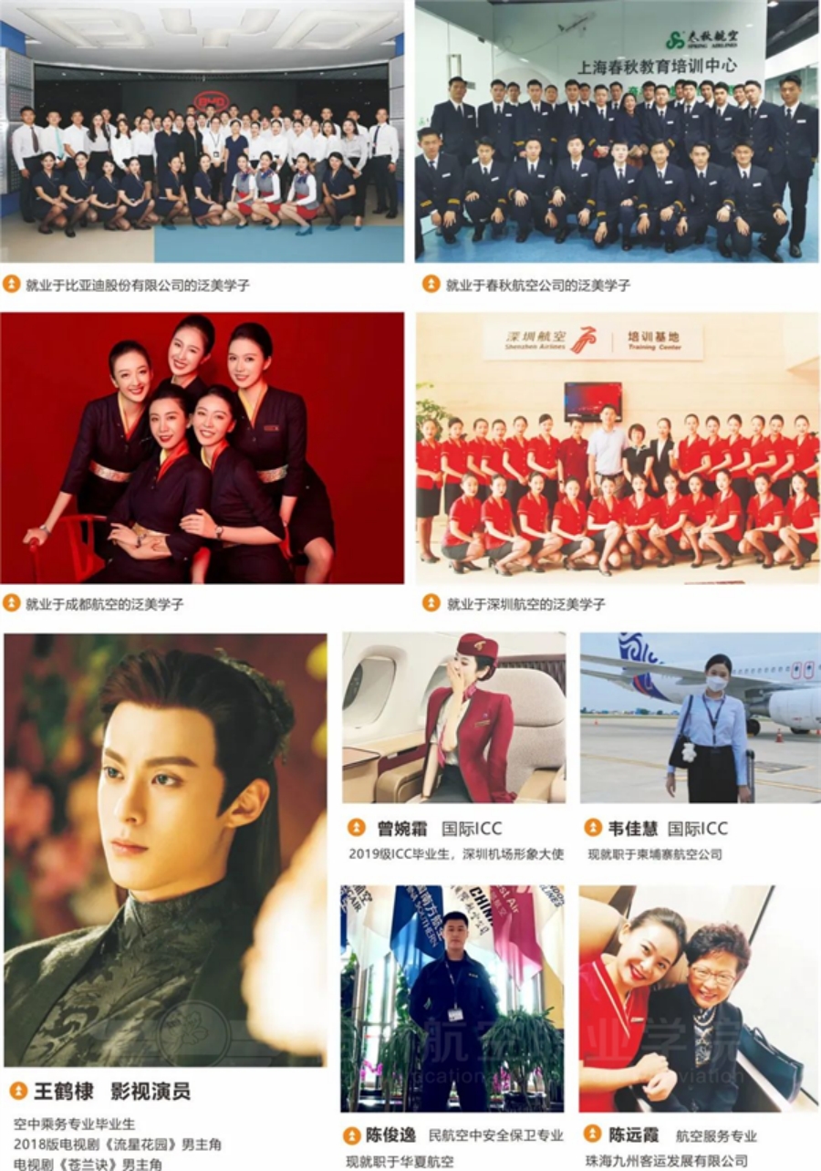 學(xué)院采用集團(tuán)化辦學(xué)模式,集團(tuán)擁有中國民航局授予的“民航客艙服務(wù)培訓(xùn)”“民航安全員培訓(xùn)”等資質(zhì),與民航機(jī)場、航空公司、北京中軟國際教育科技股份有限公司等建立有合作關(guān)系,畢業(yè)生將主要就業(yè)于飛行、空乘、空保、無人機(jī)駕駛、飛機(jī)維修、安檢、航空物流、貴賓服務(wù)、值機(jī)、AI數(shù)據(jù)工程師、互聯(lián)網(wǎng)營銷師等崗位。
