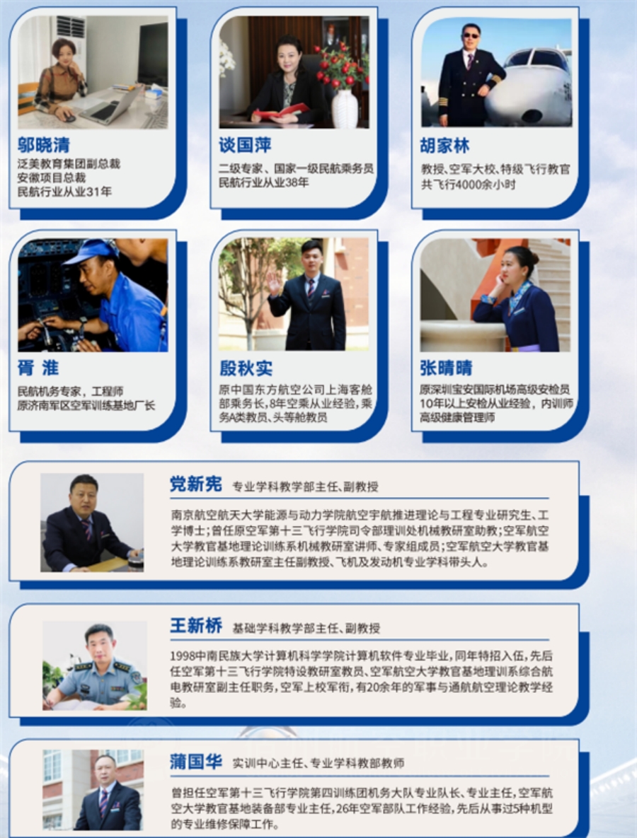 學(xué)院立足安徽、面向長三角、服務(wù)航空產(chǎn)業(yè),培養(yǎng)高素質(zhì)技術(shù)技能型人才,開設(shè)無人機(jī)應(yīng)用技術(shù)、直升機(jī)駕駛技術(shù)、定翼機(jī)駕駛技術(shù)、空中乘務(wù)、民航安全技術(shù)管理、飛機(jī)機(jī)電設(shè)備維修、機(jī)場運(yùn)行服務(wù)與管理、人工智能技術(shù)應(yīng)用、網(wǎng)絡(luò)營銷與直播電商等十五大專業(yè)。