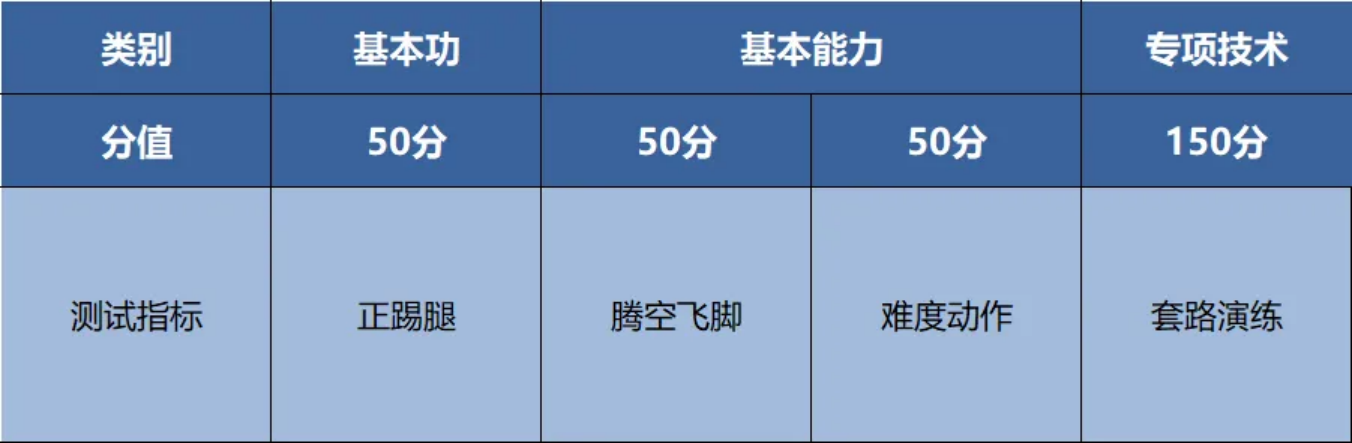 (4)武術(含舞龍舞獅)項目測試指標與所占分值