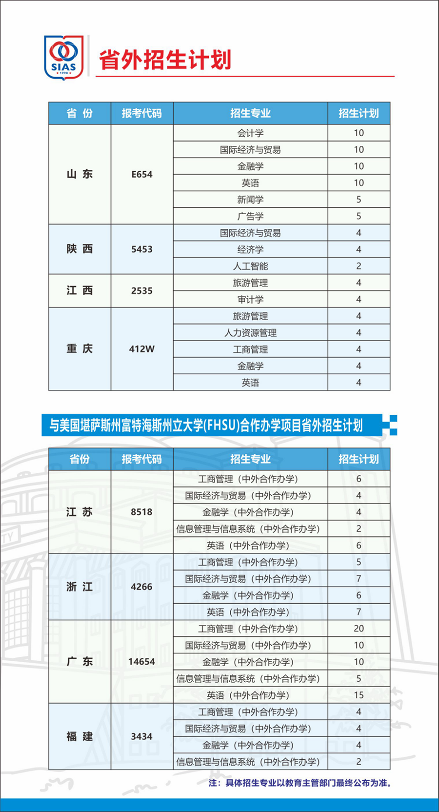 第八條 學(xué)校本科、???、專升本、與美國(guó)堪薩斯州富特海斯州立大學(xué)合作辦學(xué)項(xiàng)目招生專業(yè)及計(jì)劃數(shù)以所在省教育主管部門公布的招生計(jì)劃為準(zhǔn)。