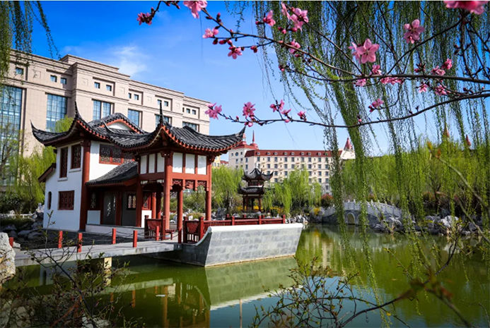 學(xué)校占地面積 2300 余畝,已建成風(fēng)格各異的教學(xué)館舍91萬平方米,校園整體由美國(guó)著名建筑師皮特·邁克·維斯 (Peter Michael Weiss)設(shè)計(jì),擁有歐洲街、意大利廣場(chǎng)、莫斯科紅場(chǎng)、西班牙街和倫敦街等中外建筑風(fēng)格交融的十大國(guó)際文化小鎮(zhèn)及中國(guó)園、法國(guó)園等八大國(guó)際主題園林。通過環(huán)境育人,讓學(xué)生在濃郁的國(guó)際化成長(zhǎng)氛圍中,實(shí)現(xiàn)“未出國(guó)門看世界”,在潛移默化中拓展視野、提升格局。