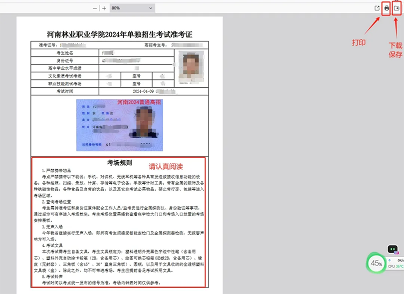 準(zhǔn)考證打印時(shí)間為4月5日8時(shí)至4月9日12時(shí),點(diǎn)擊右上角按鈕,選擇直接打印或下載保存。請(qǐng)用A4紙打印準(zhǔn)考證,彩色、黑白均可。準(zhǔn)考證打印后請(qǐng)認(rèn)真閱讀考場(chǎng)規(guī)則,并妥善保存,考試時(shí)憑準(zhǔn)考證、身份證進(jìn)入考場(chǎng)。