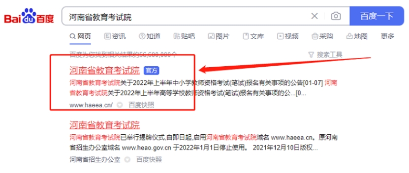 考生登錄河南省教育考試院官(http://www.haeea.cn/),或在搜索引擎中輸入“河南省教育考試院”,點(diǎn)擊帶有“官方”標(biāo)識(shí)的網(wǎng)站。