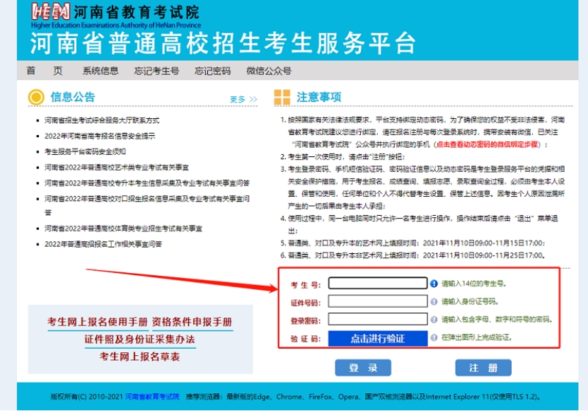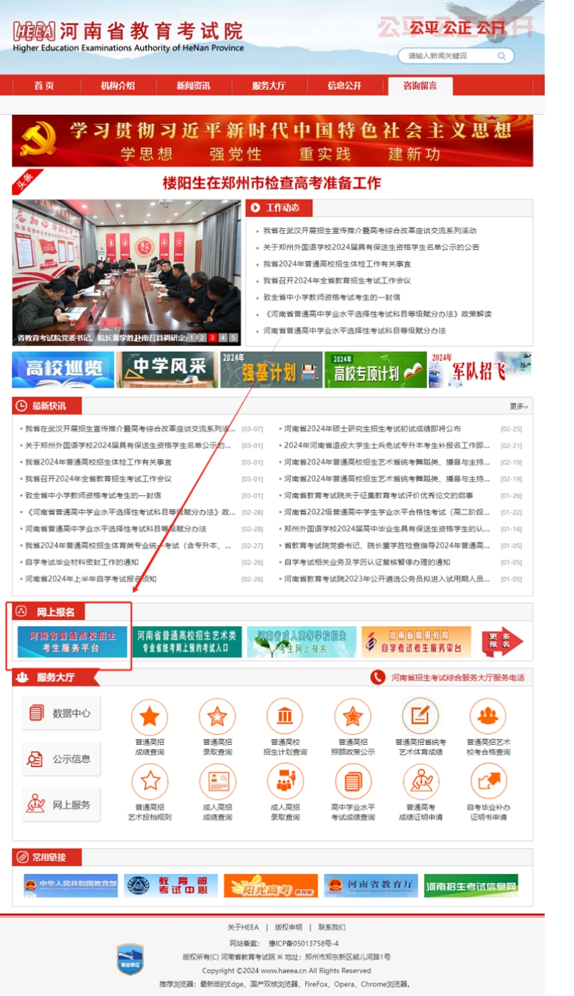 點(diǎn)擊跳轉(zhuǎn)進(jìn)入河南省教育考試院官網(wǎng),點(diǎn)擊如下圖示位置,進(jìn)入“河南省普通高校招生考生服務(wù)平臺(tái)”