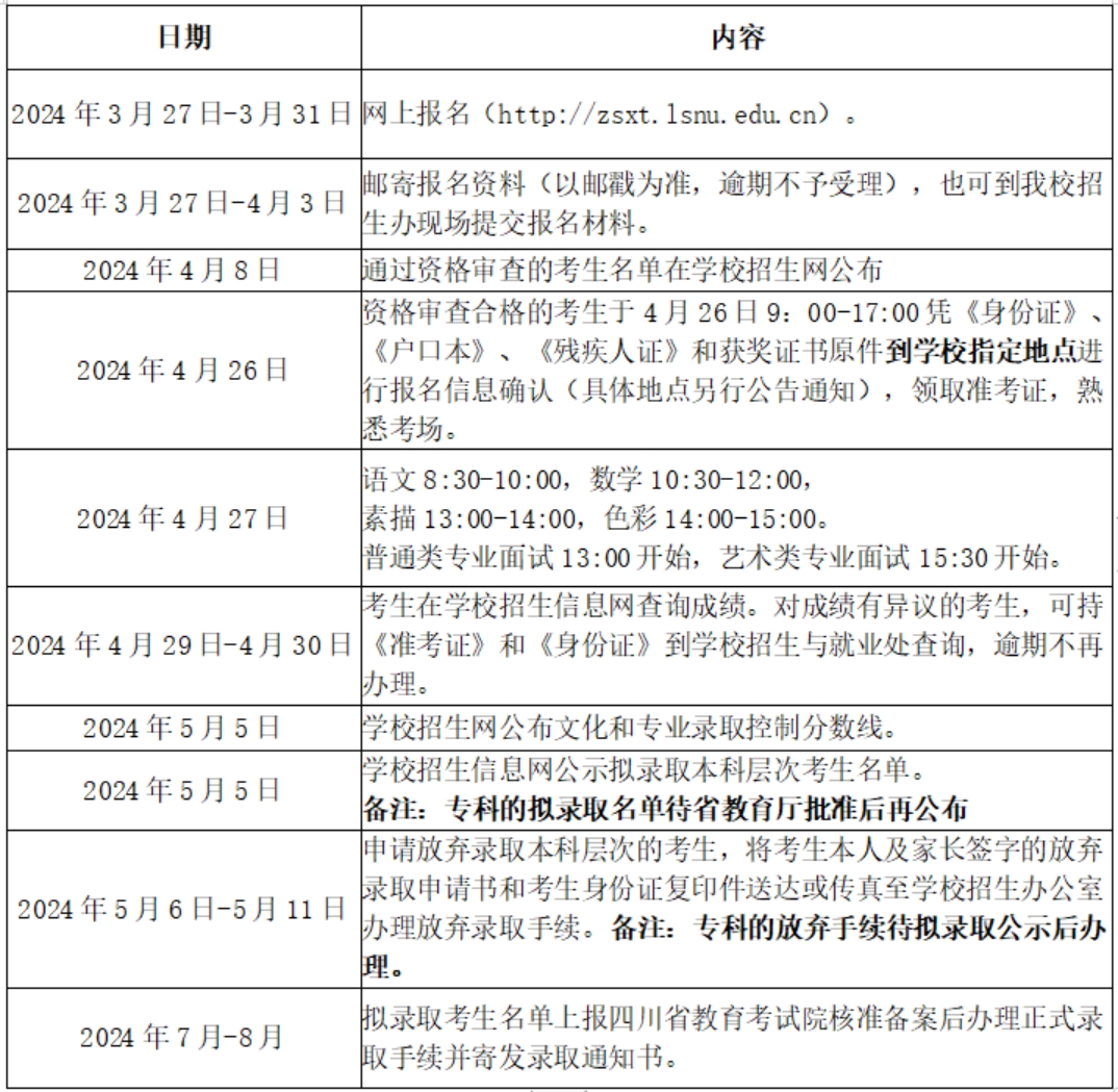 我校將招生簡章和考試大綱報(bào)省考試院備案后向社會(huì)公布,請(qǐng)考生按要求將報(bào)名材料在2024年4月3日前(以郵戳為準(zhǔn))現(xiàn)場提交或者通過順豐、EMS郵政快遞郵寄(其余快遞有可能不能正常投遞,因報(bào)名材料不能及時(shí)送達(dá)導(dǎo)致錯(cuò)過報(bào)名時(shí)間的,由考生自行負(fù)責(zé))到我校招生辦公室(郵寄地址:樂山市市中區(qū)濱河路778號(hào)樂山師范學(xué)院招生辦公室,聯(lián)系人:李老師。電話:0833-2276288,郵編:614000),逾期不再受理。