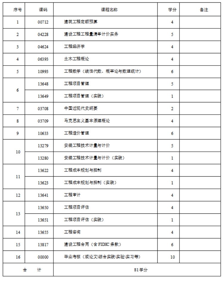 工程造價(專升本)專業(yè)課程設(shè)置與學(xué)分